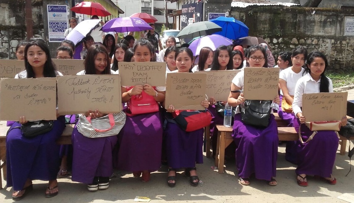 Imphal, September 11: GP Women College students today staged a sit-in in front of the college campus demanding the availability of Meitei Mayek text book for B.A. first semester.