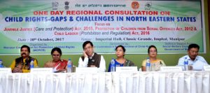 Imphal, October 10, 2017 (DIPR): A One day Regional Consultation on ‘Child Rights – Gaps & Challenges in North Eastern States’ was held today at Imperial Hall, The Classic Grande with focus on Juvenile Justice (Care and Protection) Act, 2015, Protection of Children from Sexual Offences (POCSO) Act, 2012 and The Child Labour (Prohibition and Regulation) Act, 2016.
