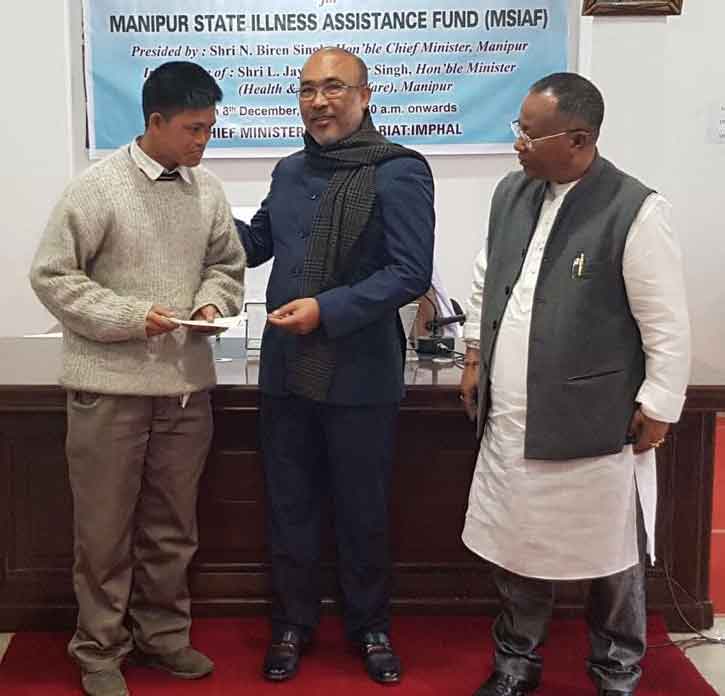 Imphal, December 08, 2017 (DIPR): Chief Minister Shri N. Biren distributed monetary aid worth Rs. 1,10,58,858 to 91 selected beneficiaries under Manipur State Illness Assistance Fund (MSIAF) at a simple ceremony held at Durbar Hall of Chief Minister’s Secretariat today.