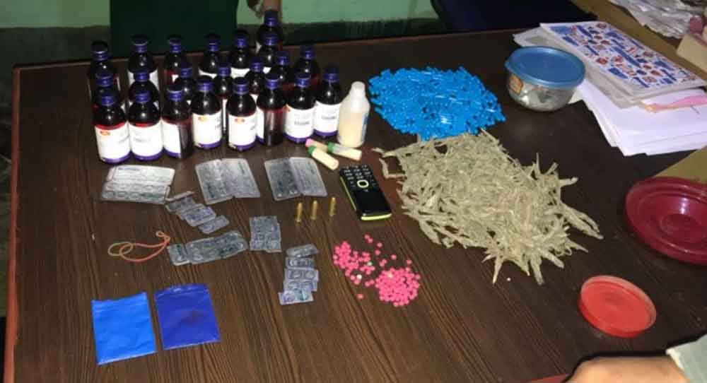 The main accused Md Indur Rehman fled from the scene however his wife Sultana @ Mumtaz, 35 was apprehended with drugs and some ammunition during the search of the house of accused Md. Indur Rehman. The recovered contraband items include 185 SP capsules, 124 WY tablets, 98 N10 tablets, 22 bottles of Codonz syrup, 211 grams of contraband ganja, 15 grams of heroin No.4 and three 9mm live rounds were also found and seized.
