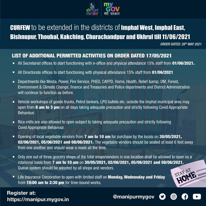In exercise of the powers conferred under Section 20(2)(a) of the Disaster Management Act, 2005, chief secretary Rajesh Kumar in his capacity as Chairperson, State Executive Committee of the State Disaster Management Authority, declared extension of curfew in Imphal West, Imphal East, Bishnupur, Thoubal, Kakching, Churachandpur and Ukhrul districts with limited permitted activities and the guidelines including restrictions on inter district movements in respect of the remaining Senapati, Kangpokpi, Kamjong, Tengnoupal, Chandel, Pherzawl, Noney, Tamenglong and Jiribam districts for another 14 days with some additional permitted activities.