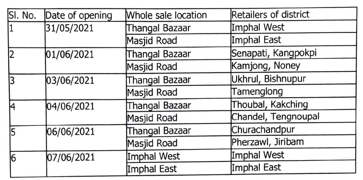 Whole sale shops of grocery and food Road essentials located in Thangal Bazaar and Masjid will be allowed to open from 7am to 12 noon as per schedule.