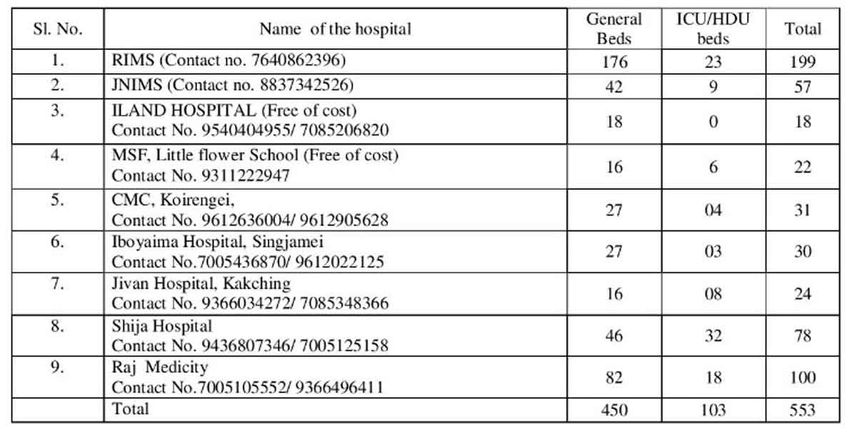The new positive cases belonged to Imphal East (59), Imphal West (94), Thoubal (4), Bishnupur (15), Kakching (4), Ukhrul (14), Churachandpur (14), Chandel (5), Senapati (5), Tamenglong (14), Tengnoupal (2), Noney (5), Kamjong (1), Kangpokpi (17) and CAPF (10).