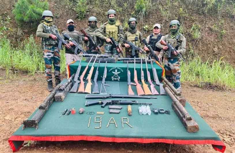 The recovered items in Kangpokpi were one 5.56mm INSAS rifle, one .303 rifle, five bolt action rifles, three single barrel rifles, two pull mech. rifles, six improvised mortars, one 36 hand-grenade, four 36 hand-grenade detonators, two 36 hand-grenade arming rings, three rubber bullets, ten 5.56mm INSAS live rounds, two tube launchers, one 2” mortar HE shells, thirty 7.62mm blank rounds, one 5.56mm INSAS rifle magazine, one 5.56mm INSAS LMG magazine and one hand held radio set with charger.