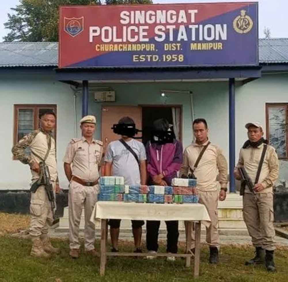 Imphal: Manipur Police arrested two drug smugglers from the vicinity of Pioneer Camp, along NH-102B, Singhat-PS, Churachandpur district, on Tuesday.