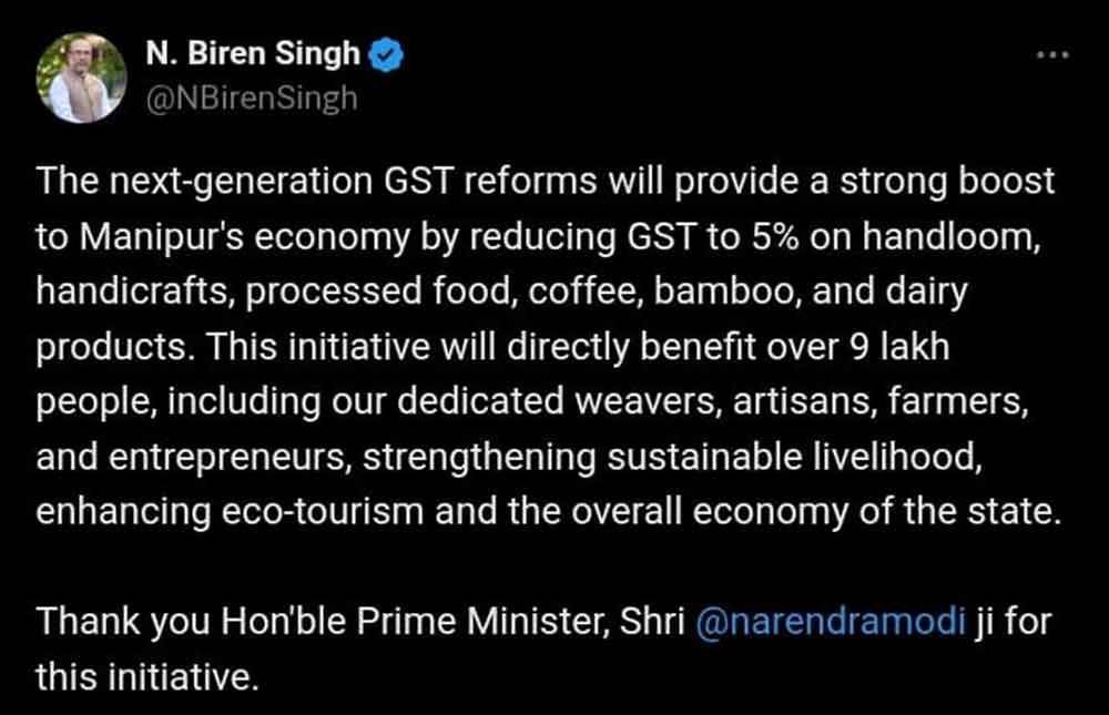 Biren on Sunday at his X wrote “The next-generation GST reforms will provide a strong boost to Manipur’s economy by reducing GST to 5% on handloom, handicrafts, processed food, coffee, bamboo, and dairy products. This initiative will directly benefit over 9 lakh people, including our dedicated weavers, artisans, farmers, and entrepreneurs, strengthening sustainable livelihood, enhancing eco-tourism and the overall economy of the state.”